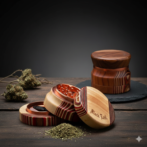 Das Mahlwerk des 4-teiligen Holzgrinders im Ethnolook besteht aus Aluminium und lässt sich mühelos drehen. Die diamantförmig geschliffenen Zähne zerkleinern Buds und Blüten zuverlässig.