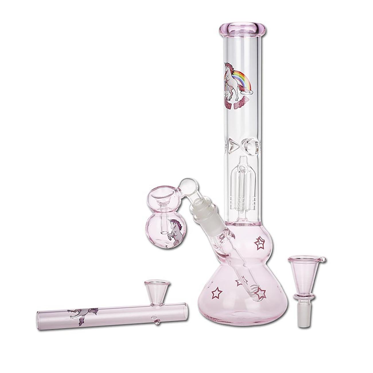 🎨 Design & Stil: Klares Glas mit rosa Akzenten und Einhorn-Motiv – eine auffällige und verspielte Ästhetik, besonders für Fans von auffälligem Design. Das Set kombiniert Funktion mit Stil.