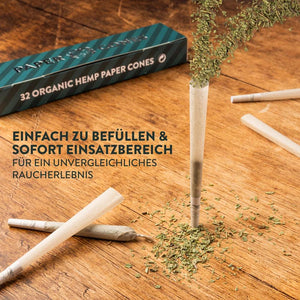 ?? Hohe Qualität und Fürsorge: Unsere Hanfpaper Cones werden mit großmütterlicher Fürsorge hergestellt und verpackt. Besonders wichtig ist uns die Nutzung von organischem Hanf, um ein unverfälschtes und reines Raucherlebnis zu bieten.