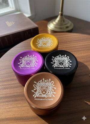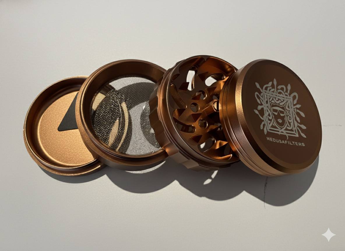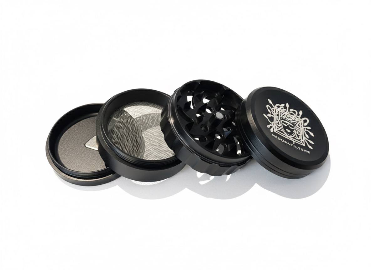 🧽 Zubehör & Komfort: Im Lieferumfang ist ein kleiner Schaber enthalten – damit lässt sich alles aus dem Grinder herausnehmen. Der Deckel ist zudem mit dem gravierten „Medusafilters“-Logo versehen.