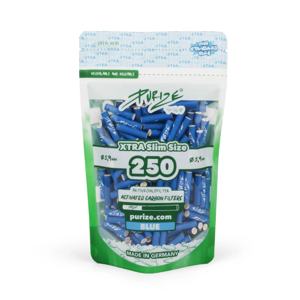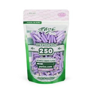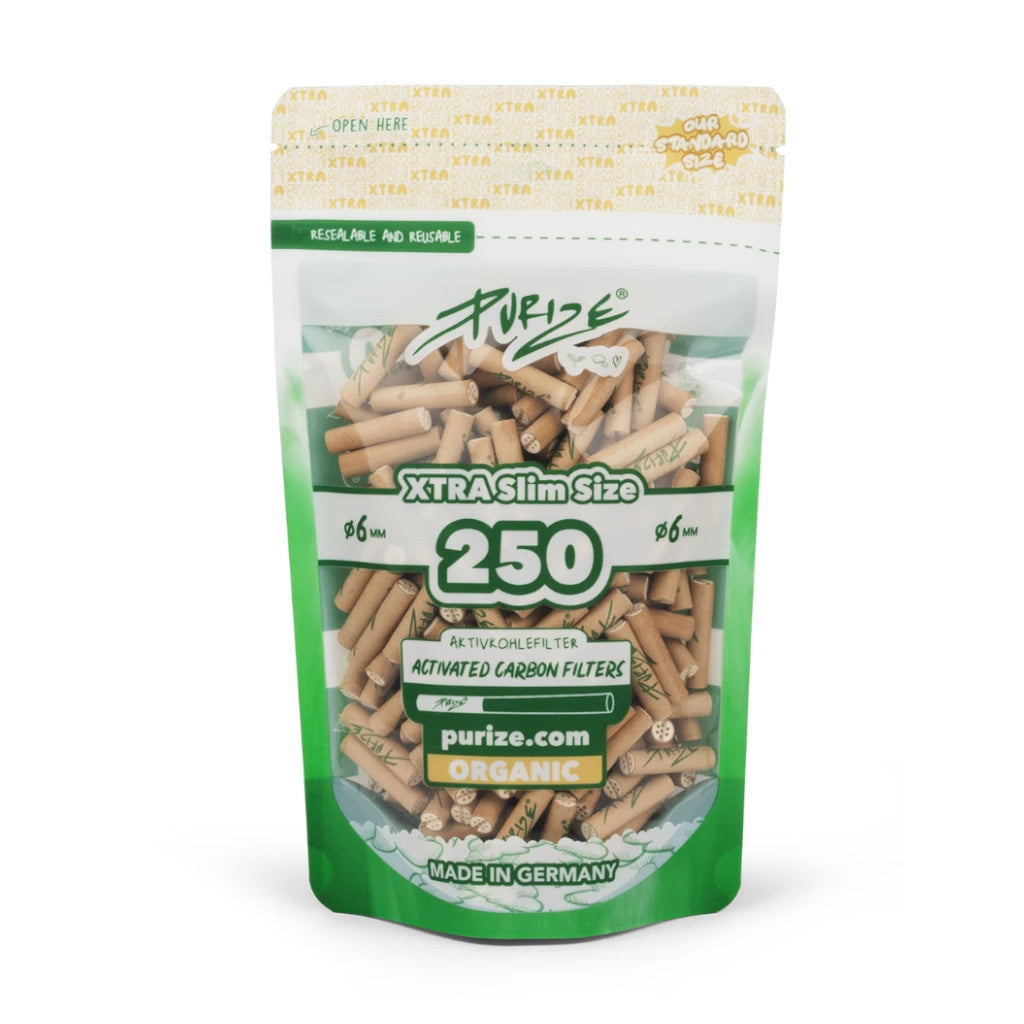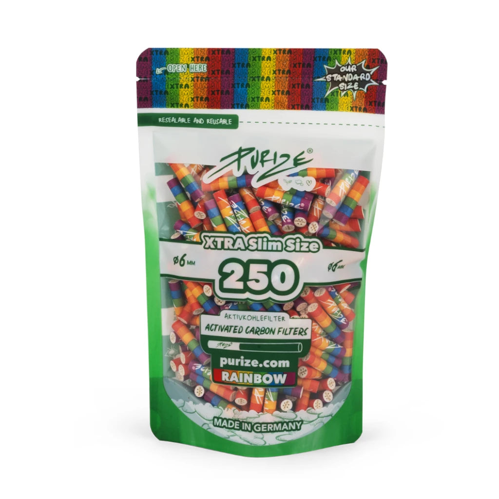 Diese PURIZE XTRA Slim Size Filter haben einen Durchmesser von 6 mm und werden im großen 250-Stück Vorratspack geliefert. Ideal für feine Selbstgedrehte und kompatibel mit gängigen 6-mm-Rauchformaten.